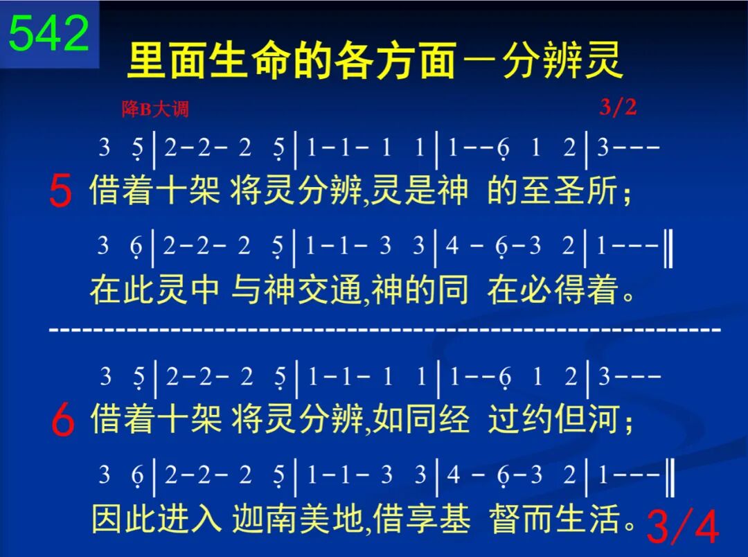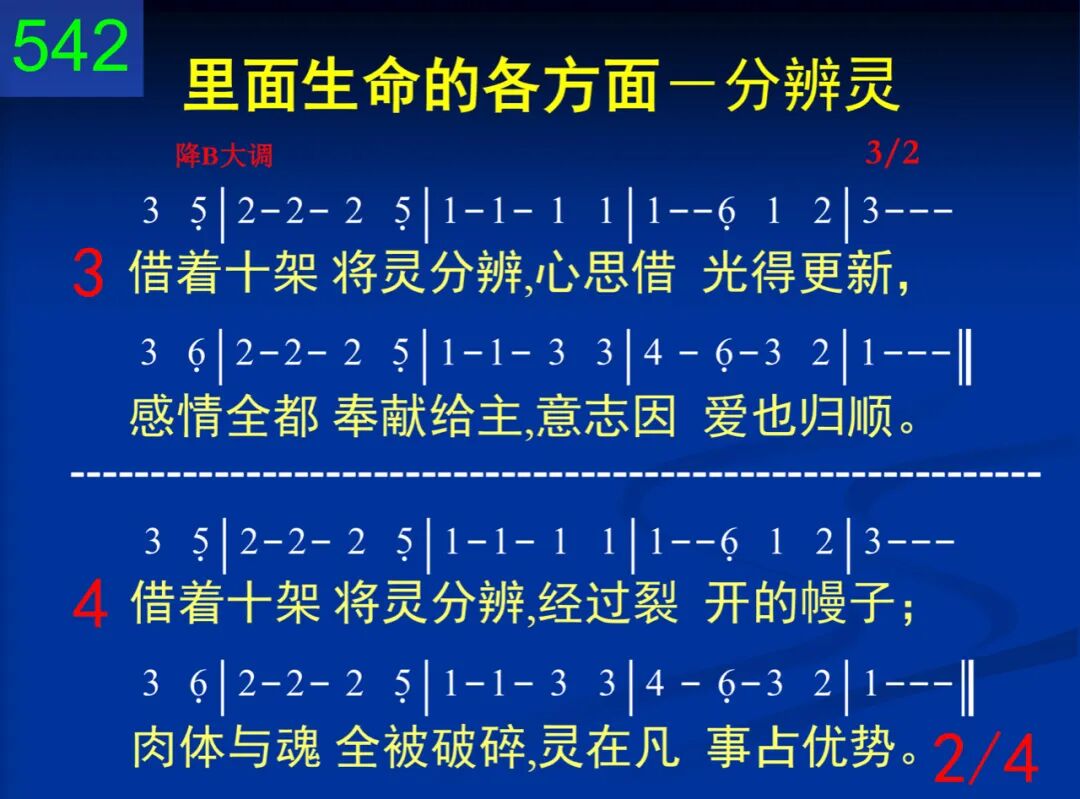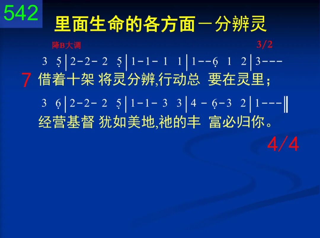 藉着十架将灵分辨,时常将魂置死地;背着十架,拒绝自己,终日活在你灵里。 二 藉着十架将灵分辨,靠神生命的活话;将魂全然从灵分开,行在灵中不稍差。 三 藉着十架将灵分辨,心思藉光得更新,感情全都奉献给主,意志因爱也归顺。 四 藉着十架将灵分辨,经过裂开的幔子;肉体与魂全被破碎,灵在凡事占优势。 五 藉着十架将灵分辨,灵是神的至圣所;在此灵中与神交通,神的同在必得着。 六 藉着十架将灵分辨,如同经过约但河;因此进入迦南美地,藉享基督而生活。 七 藉着十架将灵分辨,行动总要在灵里;经营基督犹如美地,祂的丰富必归你。