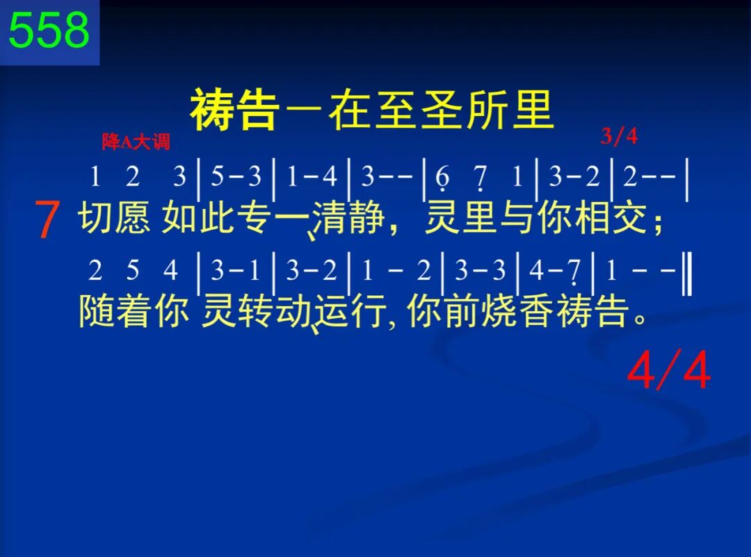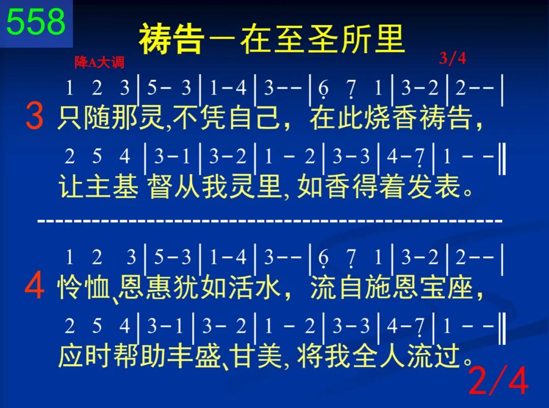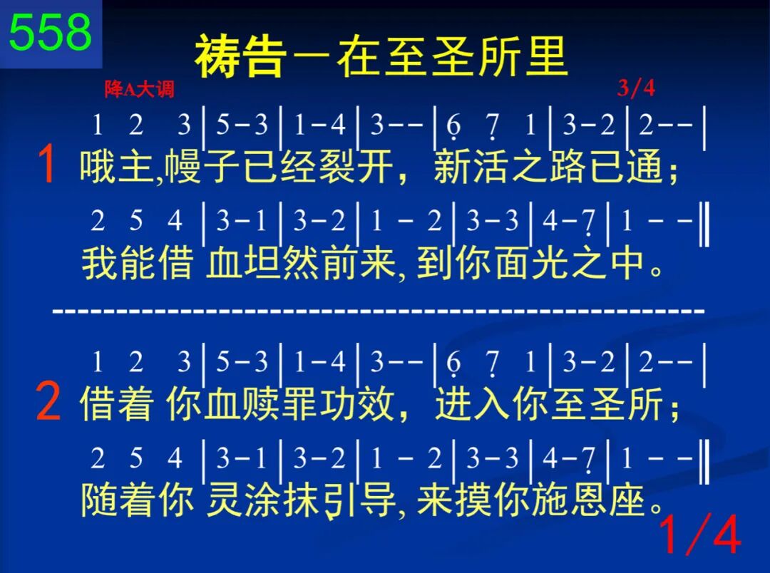 哦主,幔子已经裂开,新活之路已通;我能藉血坦然前来,到你面光之中。 二 藉着你血赎罪功效,进入你至圣所;随着你灵涂抹、引导,来摸你施恩座。 三 只随那灵,不凭自己,在此烧香祷告,让主基督从我灵里,如香得着发表。 四 怜恤、恩惠犹如活水,流自施恩宝座,应时帮助丰盛、甘美,将我全人流过。 五 虽然不为事物求讨,只随那灵祷告,你却知道一切需要,必为我们照料。 六 纵然有何忧苦、挂虑,也能不受搅扰;一切全都交你担去,我灵就得逍遥。 七 切愿如此专清静,灵里与你相交;随着你灵转动、运行,你前烧香祷告。
