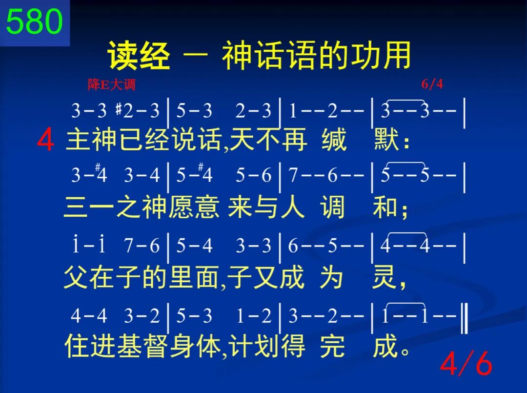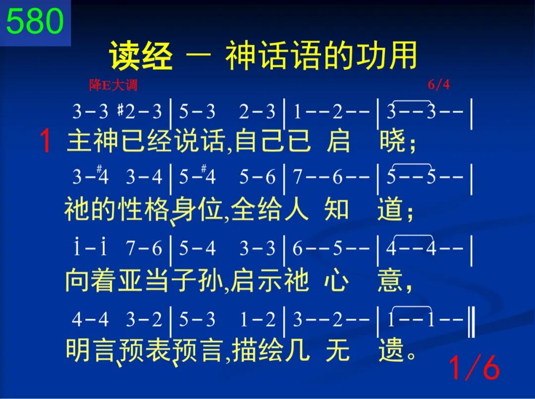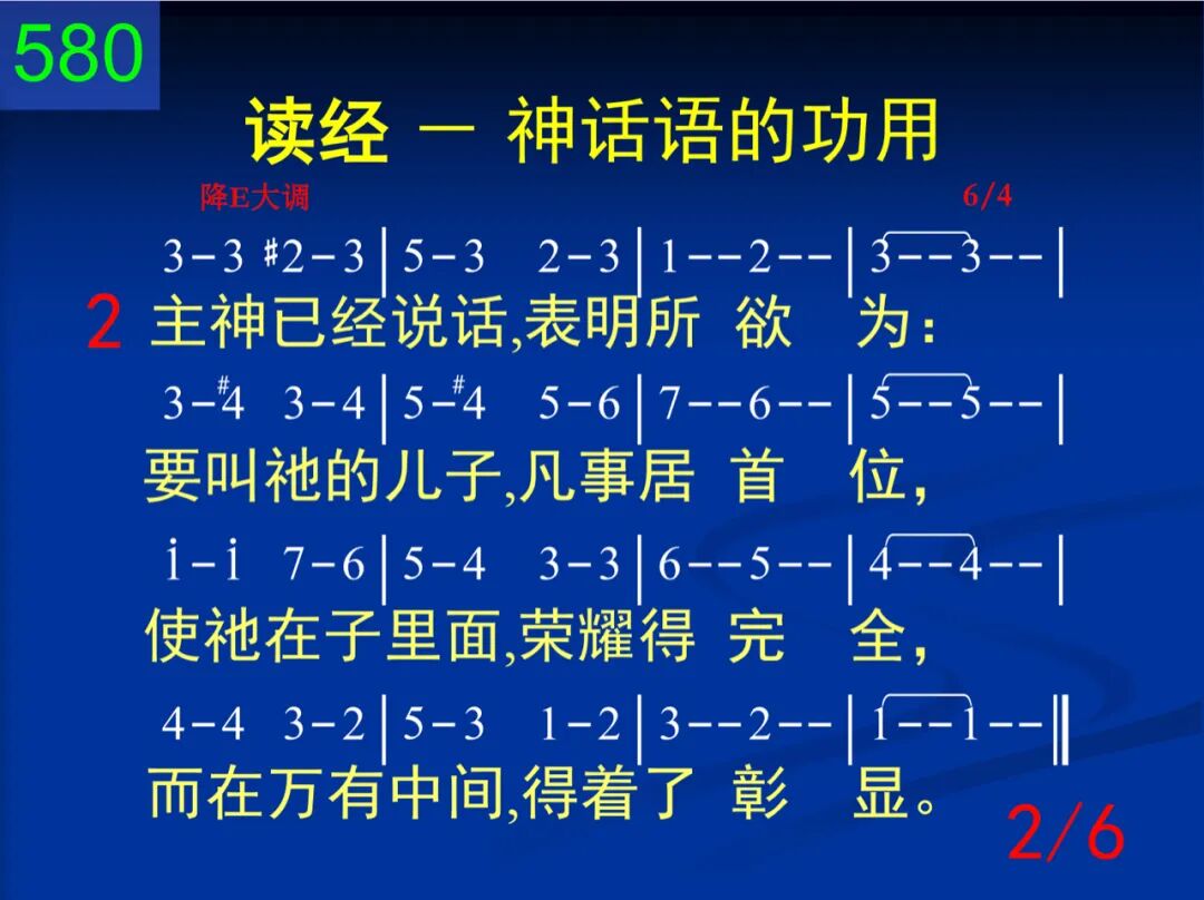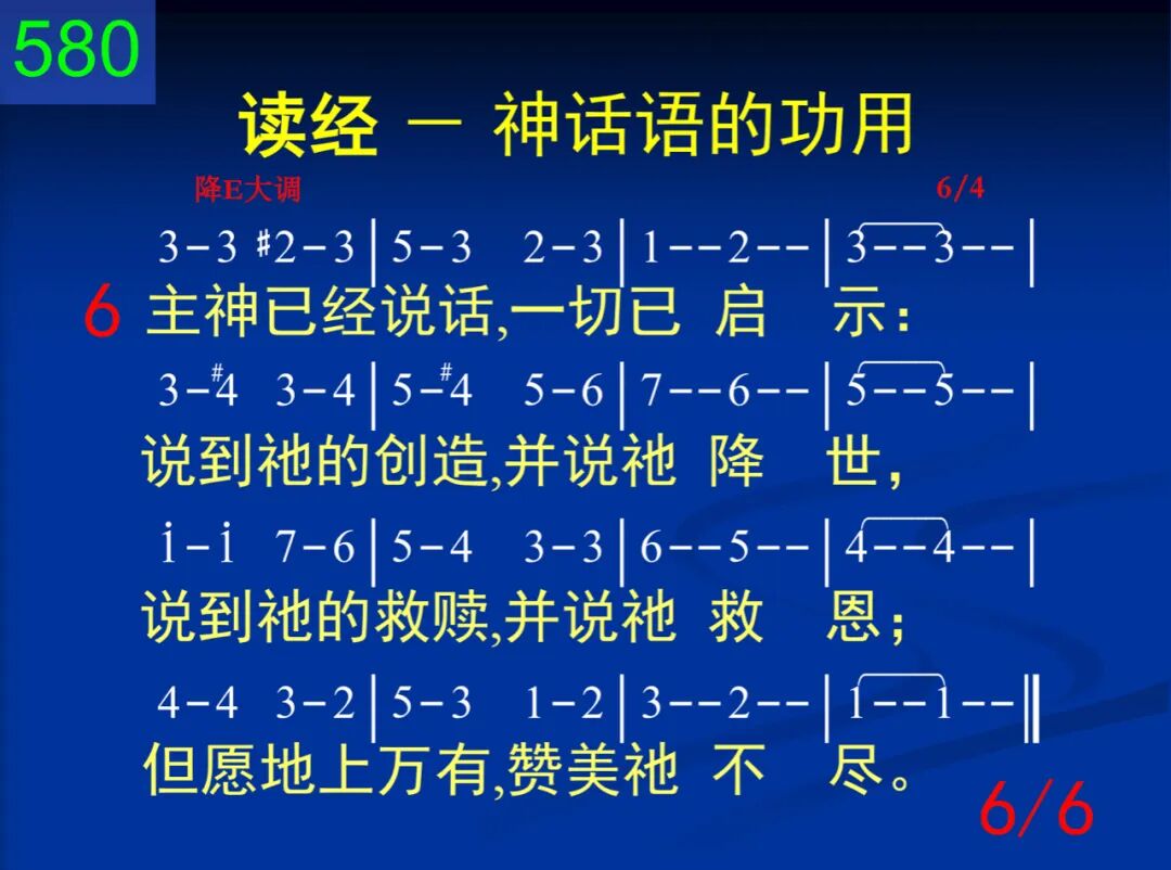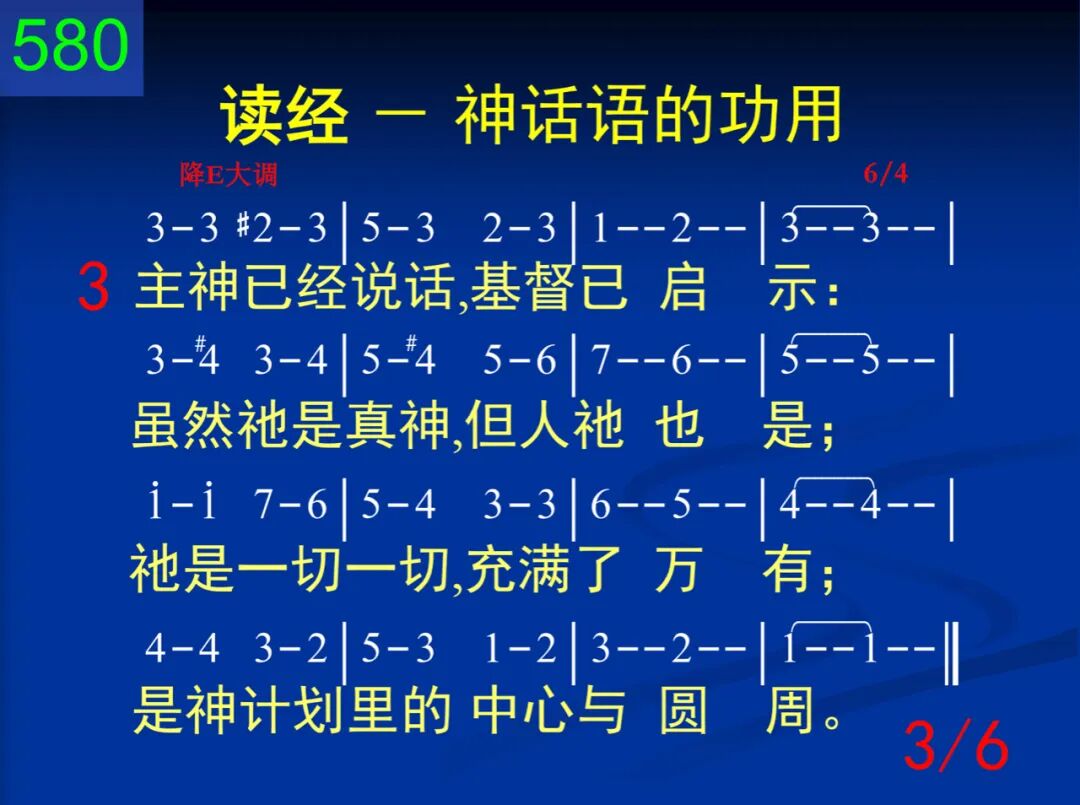 主神已经说话,自己已启晓;祂的性格、身位,全给人知道;向着亚当子孙,启示祂心意,明言、预表、预言,描绘几无遗。 二 主神已经说话,表明所欲为:要叫祂的儿子,凡事居首位,使祂在子里面,荣耀得完全,而在万有中间,得着了彰显。 三 主神已经说话,基督已启示:虽然祂是真神,但人祂也是;祂是一切一切,充满了万有;是神计划里的中心与圆周。 四 主神已经说话,天不再缄默:三一之神愿意来与人调和;父在子的里面,子又成为灵,住进基督身体,计划得完成。 五 主神已经说话,启示祂奥秘:基督与祂召会,二者成为一;基督带神丰满,来作荣耀头;召会是祂身体,享受祂所有。 六 主神已经说话,一切已启示:说到祂的创造,并说祂降世,说到祂的救赎,并说祂救恩;但愿地上万有,赞美祂不尽。