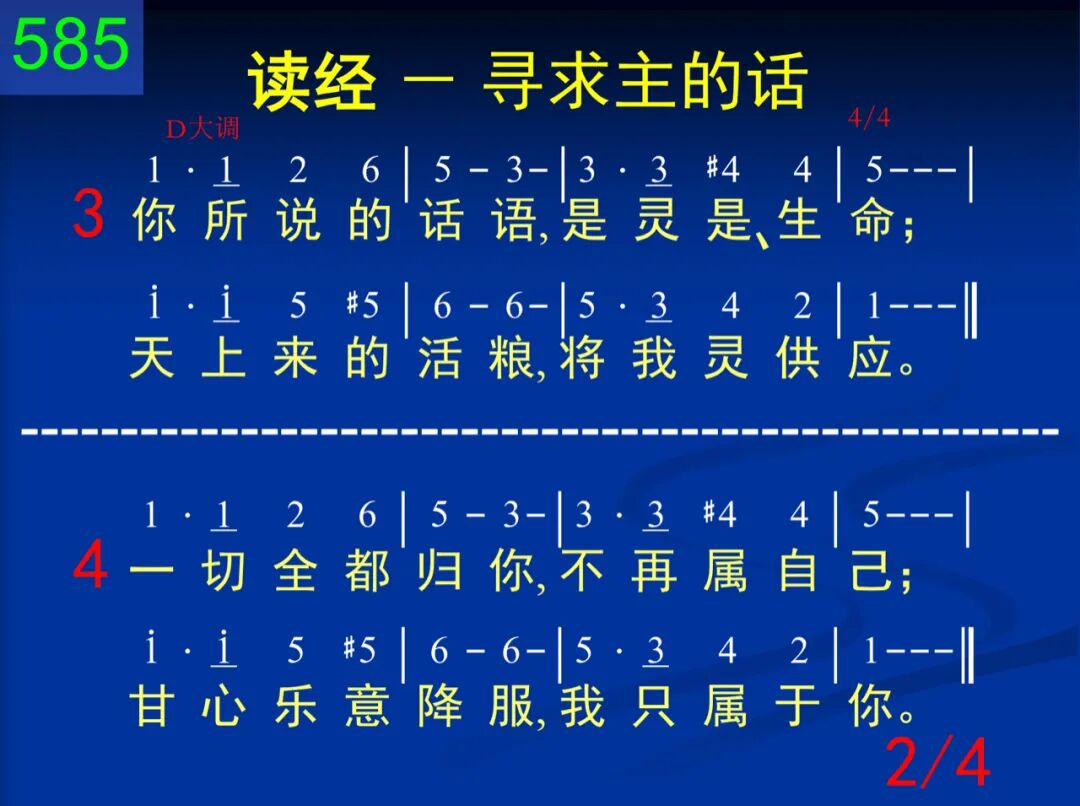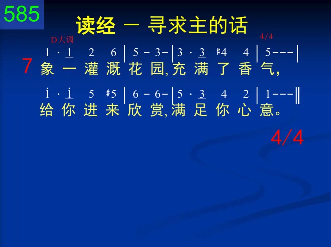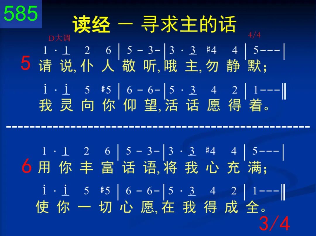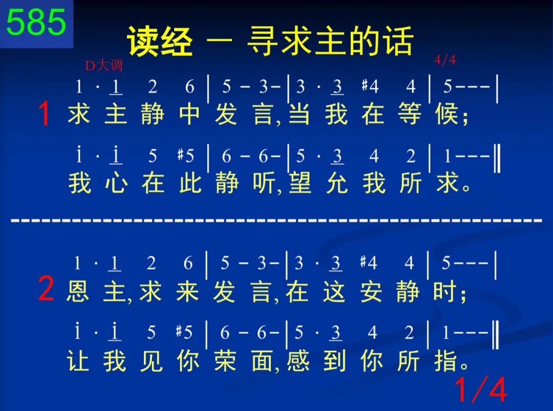 求主静中发言,当我在等候;我心在此静听,望允我所求。 二 恩主,求来发言,在这安静时;让我见你荣面,感到你所指。 三 你所说的话语,是灵、是生命;天上来的活粮,将我灵供应。 四 一切全都归你,不再属自己;甘心乐意降服,我只属于你。 五 请说,仆人敬听,哦主,勿静默;我灵向你仰望,活话愿得着。 六 用你丰富话语,将我心充满;使你一切心愿,在我得成全。 七 像一灌溉花园,充满了香气,给你进来欣赏,满足你心意。