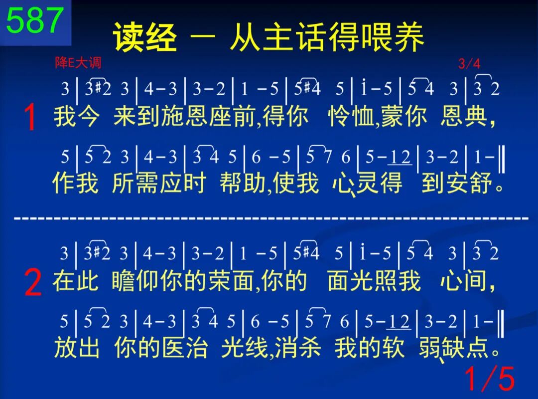 我今来到施恩座前,得你怜恤,蒙你恩典,作我所需应时帮助,使我心、灵得到安舒。 二 在此瞻仰你的荣面,你的面光照我心间,放出你的医治光线,消杀我的软弱、缺点。 三 在此你的亮光照明,显示我的真实情形;你血也就显出功能,将我罪污全都洗净。 四 你的膏油也在涂抹,你的成分给我得着;我就享受你的自己,也就摸着你的心意。 五 我愿在你面前读经,犹如祭司圣所点灯;需要你灵像油一样,使你话语放明发光。 六 也愿在此向你祷告,好像祭司将香焚烧;灵里基督如香一般,调着祷告向神呈献。 七 你话是灯,也是食物,我蒙光照,也得饱足;深愿在此多读多吃,受到启示,得着粮食。 八 基督是香,也是活水,我蒙悦纳,也脱困惫;也愿在此多祷多喝,献上香气,流出江河。 九 读经使我明亮、不饿,祷告使我馨香、不渴;读读祷祷你就注入,祷祷读读你就流出。 十 我愿如此与你相交,读祷、祷读与你相调;也愿如此给你浸透,直到你能从我涌流!
