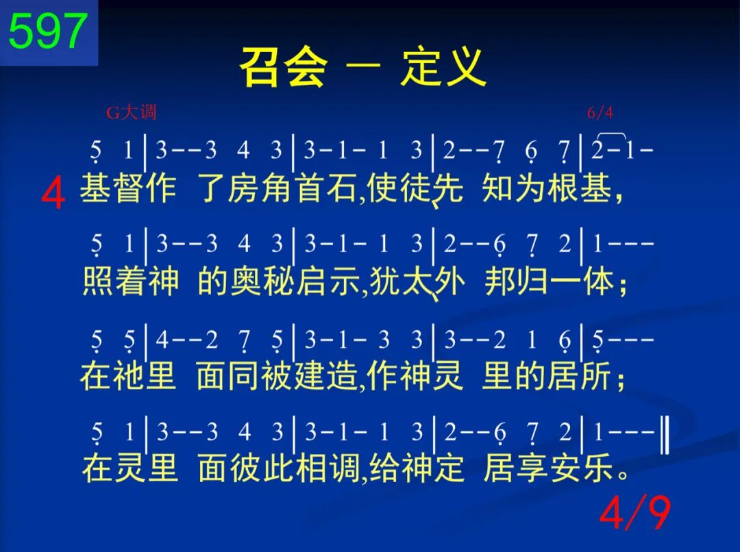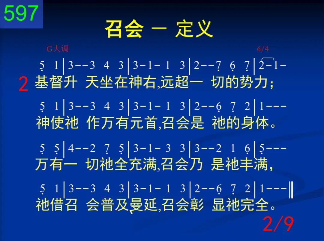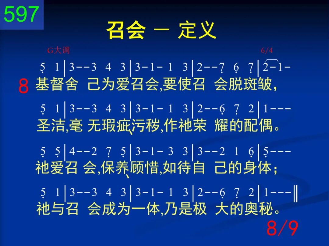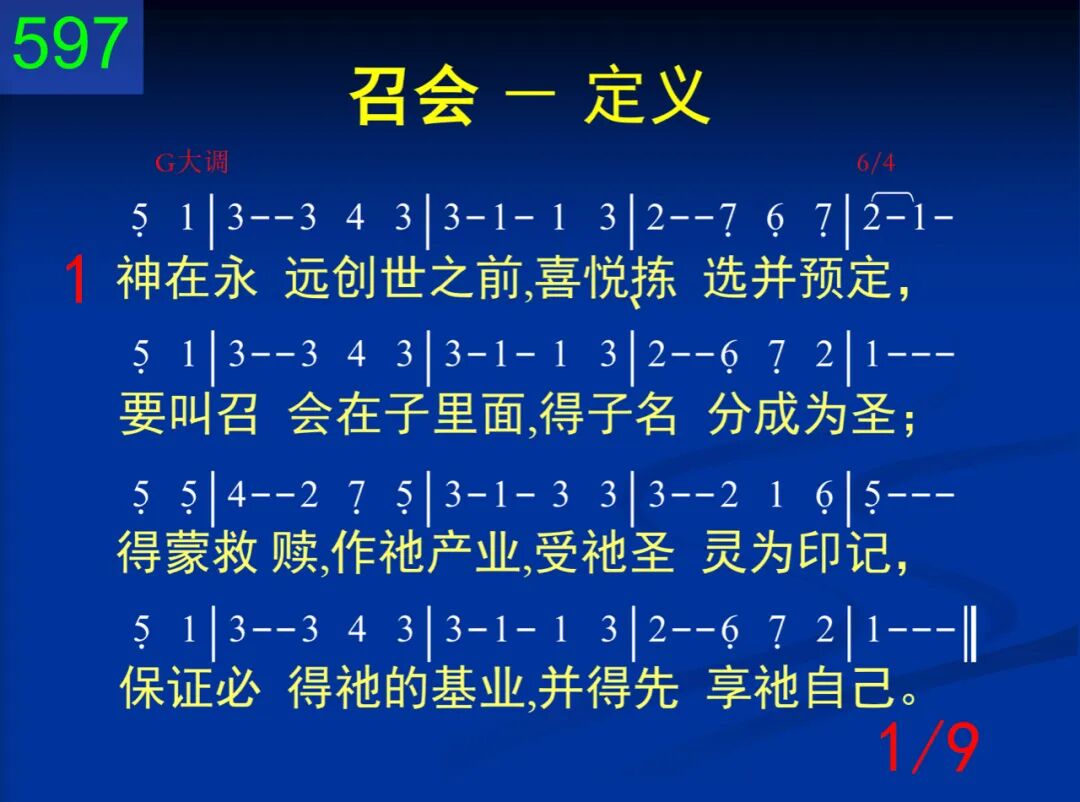 神在永远创世之前,喜悦、拣选并预定,要叫召会在子里面,得子名分成为圣;得蒙救赎,作祂产业,受祂圣灵为印记,保证必得祂的基业,并得先享祂自己。 二 基督升天坐在神右,远超一切的势力;神使祂作万有元首,召会是祂的身体。万有一切祂全充满,召会乃是祂丰满,祂藉召会普及、曼延,召会彰显祂完全。 三 原是死在罪恶之中,随从今世的风俗,撒但、邪灵竟也顺从,放纵肉体真可怒。今与基督一同复活,一同坐在高天上,成为神的荣耀杰作,基督里面所独创。 四 基督作了房角首石,使徒、先知为根基,照着神的奥秘启示,犹太、外邦归一体;在祂里面同被建造,作神灵里的居所;在灵里面彼此相调,给神定居享安乐。 五 神的奥秘乃是召会,神在永远所计划,为着彰显祂的智慧,基督也可来安家。给众圣徒明白基督,赏识基督的无限,知道祂爱超人领悟,充满神性的丰满。 六 一身、一灵、同一指望,一主、一信并一洗,一位父神,众人之上,召会因此当合一。认识基督,长大成人,有祂丰满的身量;不再受到诱骗、牵引,不再随风而飘荡。 七 基督赐下各样恩赐,为要建造祂身体,成全圣徒各尽其职,爱中建造她自己。脱去旧人,穿上新人,再无从前的旧样;心思灵里得以更新,满有主神的形像。 八 基督舍己为爱召会,要使召会脱斑皱,圣洁,毫无瑕疵、污秽,作祂荣耀的配偶。祂爱召会,保养、顾惜,如待自己的身体;祂与召会成为一体,乃是极大的奥秘。 九 身体、居所、新人、配偶,召会不仅是这些;也是战士,为神争斗,将神仇敌全除灭。穿戴神的全副军装,赖主大能而刚强;靠主站住,靠灵抵挡,祷告随时又多方。第七节的“心思灵里,”意思是在心思的灵里。