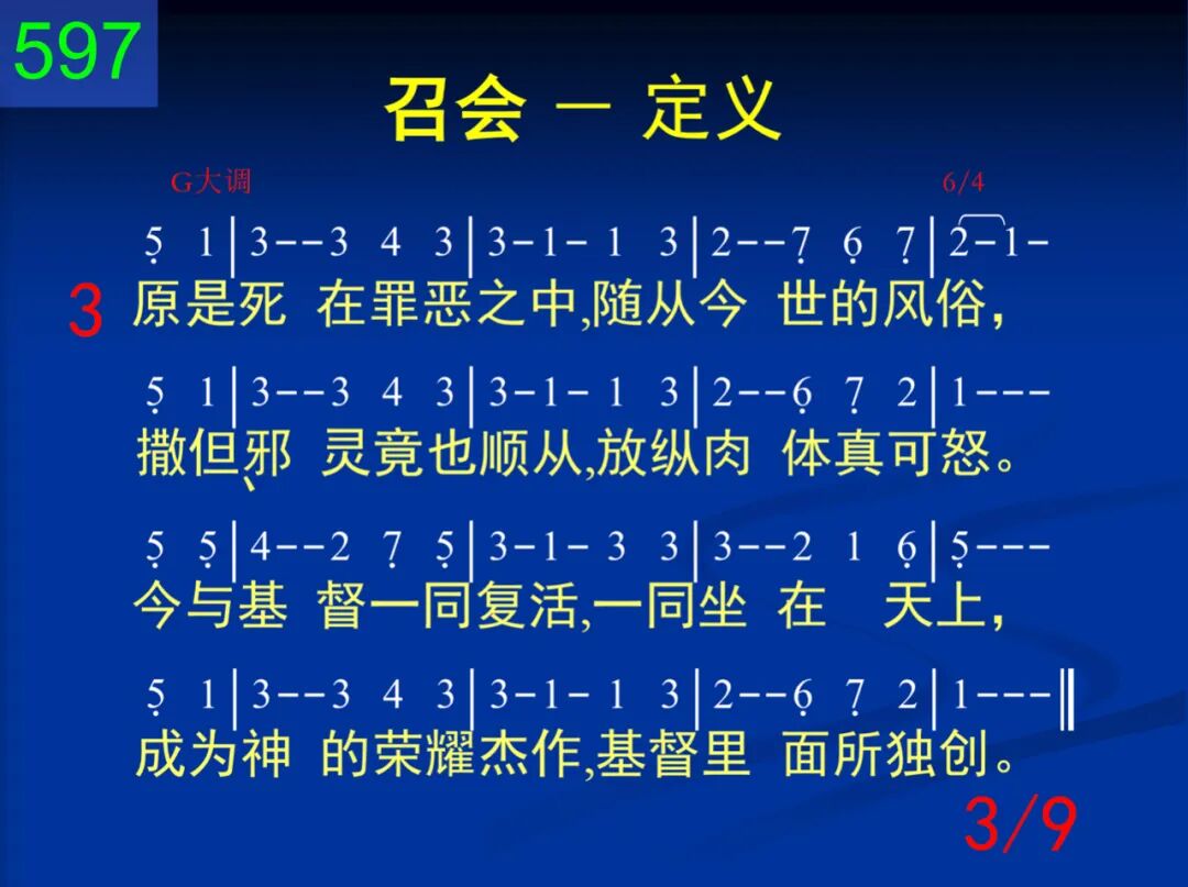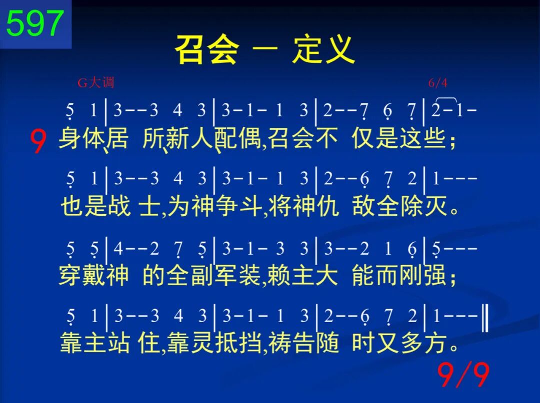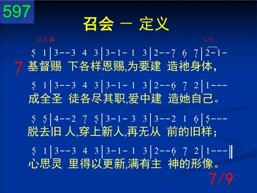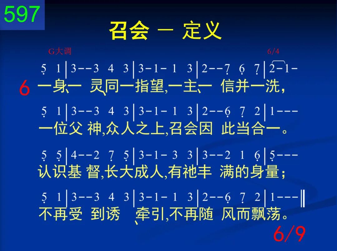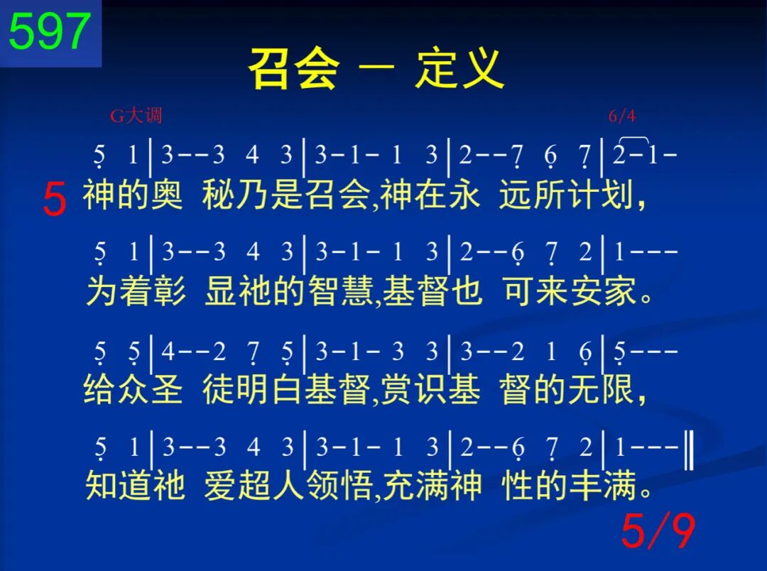 神在永远创世之前,喜悦、拣选并预定,要叫召会在子里面,得子名分成为圣;得蒙救赎,作祂产业,受祂圣灵为印记,保证必得祂的基业,并得先享祂自己。 二 基督升天坐在神右,远超一切的势力;神使祂作万有元首,召会是祂的身体。万有一切祂全充满,召会乃是祂丰满,祂藉召会普及、曼延,召会彰显祂完全。 三 原是死在罪恶之中,随从今世的风俗,撒但、邪灵竟也顺从,放纵肉体真可怒。今与基督一同复活,一同坐在高天上,成为神的荣耀杰作,基督里面所独创。 四 基督作了房角首石,使徒、先知为根基,照着神的奥秘启示,犹太、外邦归一体;在祂里面同被建造,作神灵里的居所;在灵里面彼此相调,给神定居享安乐。 五 神的奥秘乃是召会,神在永远所计划,为着彰显祂的智慧,基督也可来安家。给众圣徒明白基督,赏识基督的无限,知道祂爱超人领悟,充满神性的丰满。 六 一身、一灵、同一指望,一主、一信并一洗,一位父神,众人之上,召会因此当合一。认识基督,长大成人,有祂丰满的身量;不再受到诱骗、牵引,不再随风而飘荡。 七 基督赐下各样恩赐,为要建造祂身体,成全圣徒各尽其职,爱中建造她自己。脱去旧人,穿上新人,再无从前的旧样;心思灵里得以更新,满有主神的形像。 八 基督舍己为爱召会,要使召会脱斑皱,圣洁,毫无瑕疵、污秽,作祂荣耀的配偶。祂爱召会,保养、顾惜,如待自己的身体;祂与召会成为一体,乃是极大的奥秘。 九 身体、居所、新人、配偶,召会不仅是这些;也是战士,为神争斗,将神仇敌全除灭。穿戴神的全副军装,赖主大能而刚强;靠主站住,靠灵抵挡,祷告随时又多方。第七节的“心思灵里,”意思是在心思的灵里。