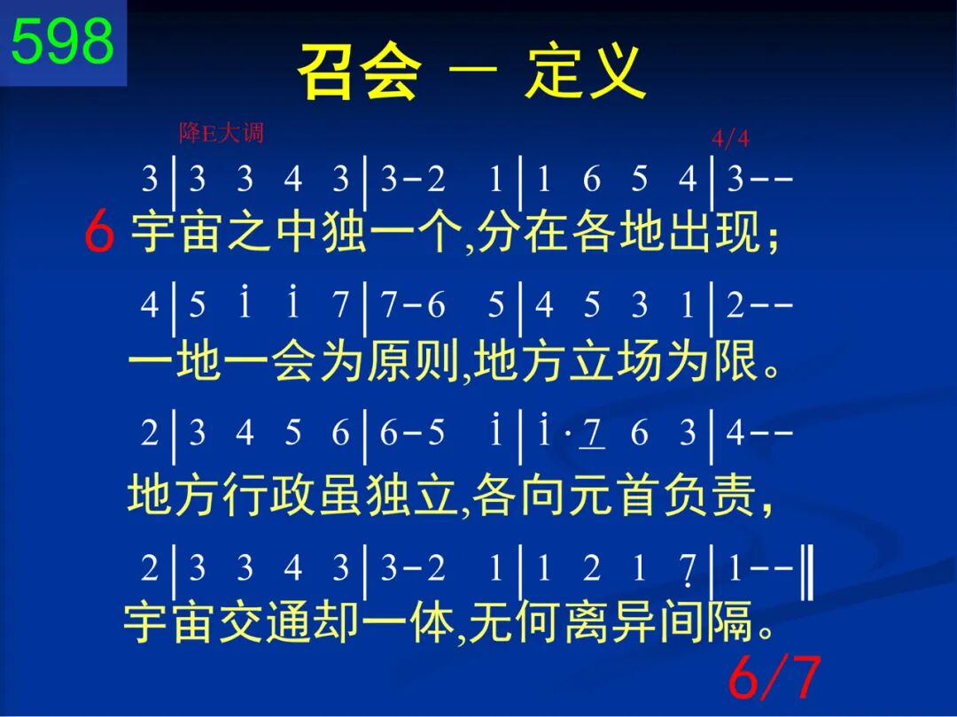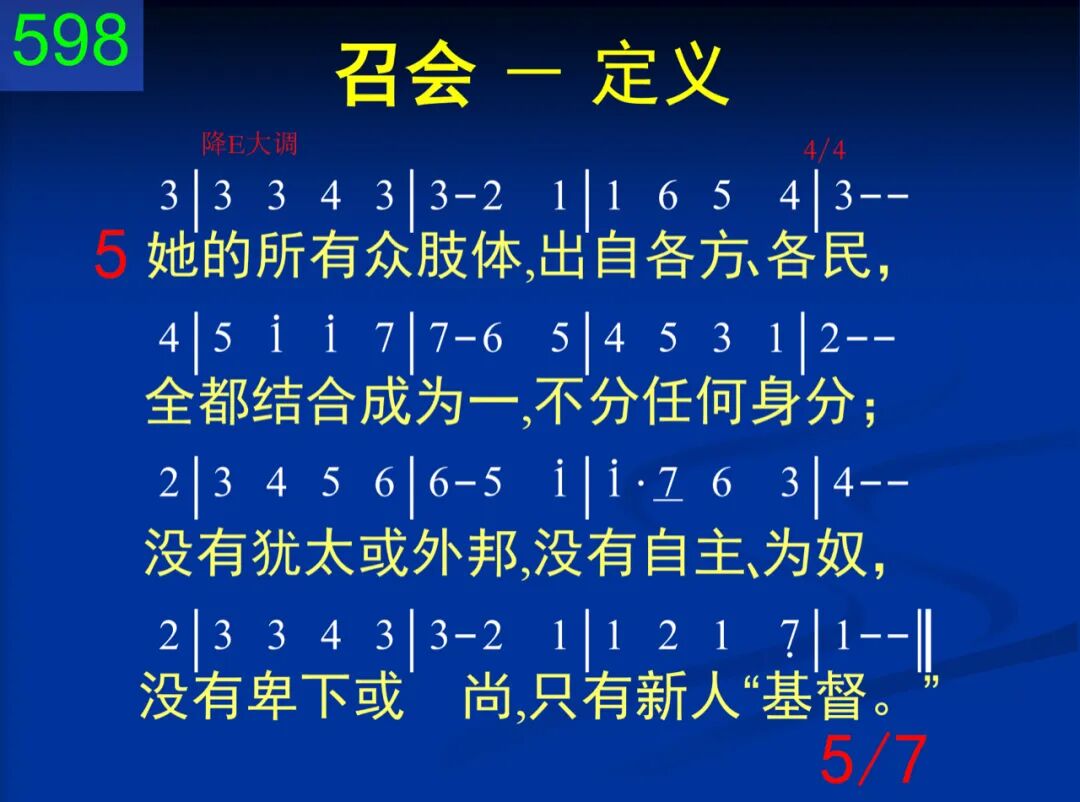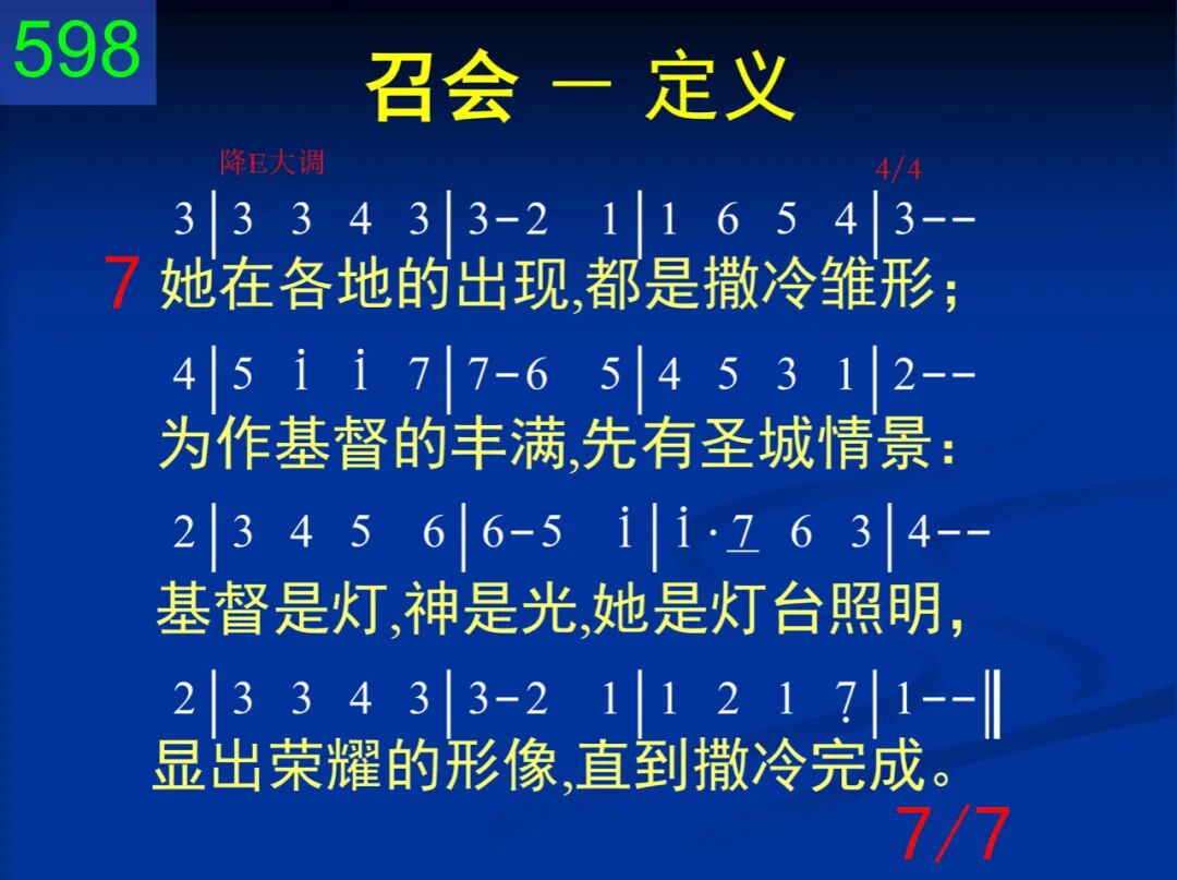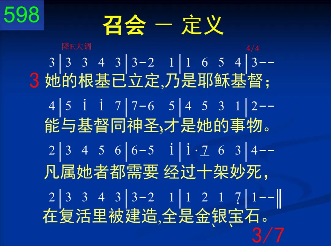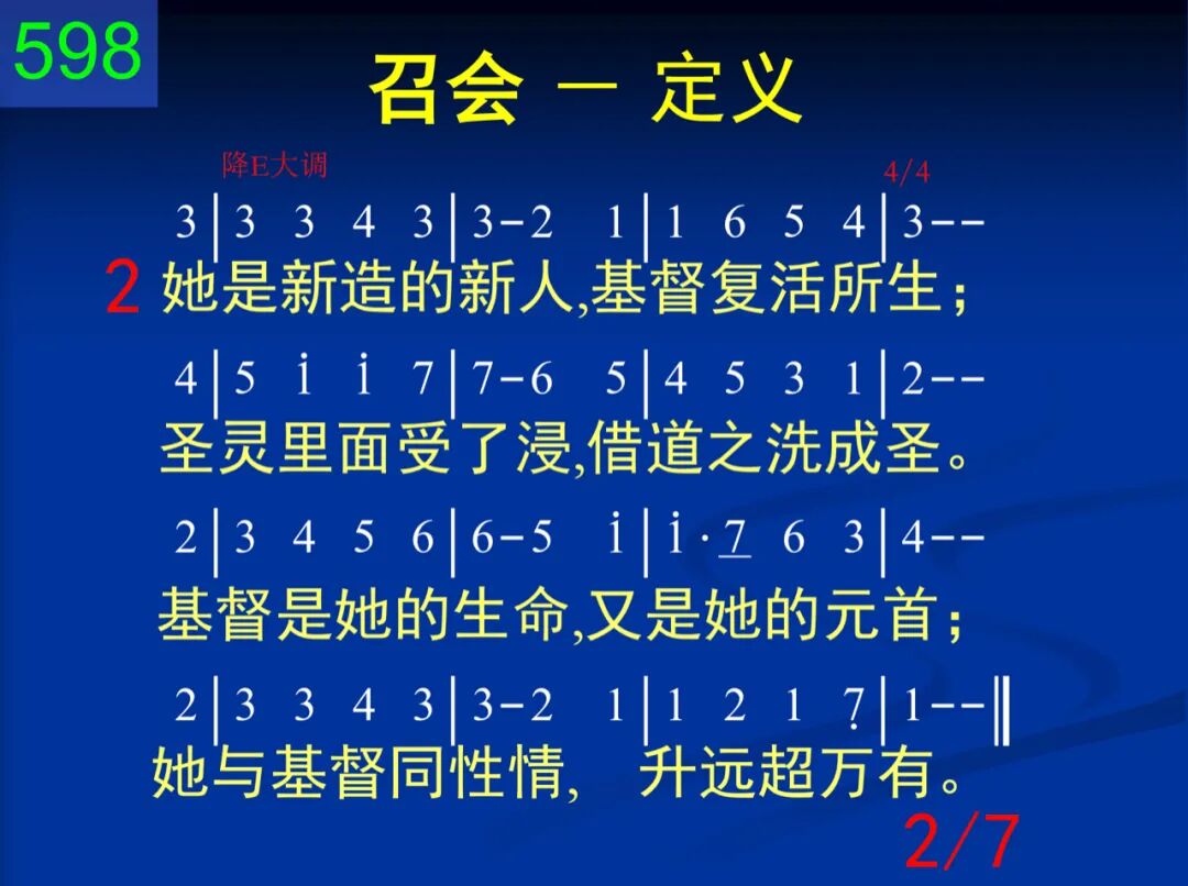 召会是主的身体,也是神的居所;是众圣徒的结集,也是神人调和;创世以前神所选,十架主死所赎;性质、地位全属天,地上任何不属。 二 她是新造的新人,基督复活所生;圣灵里面受了浸,藉道之洗成圣。基督是她的生命,又是她的元首;她与基督同性情,高升远超万有。 三 她的根基已立定,乃是耶稣基督;能与基督同神圣,才是她的事物。凡属她者都需要经过十架妙死,在复活里被建造,全是金、银、宝石。 四 她的元素全是一:一神、一主、一灵、一身、一信并一洗,一望,神所命定。三一之神在里面,众人成为一身,藉信联结,因洗断,凭望等候主临。 五 她的所有众肢体,出自各方、各民,全都结合成为一,不分任何身分;没有犹太或外邦,没有自主、为奴,没有卑下或高尚,只有新人“基督。” 六 宇宙之中独一个,分在各地出现;一地一会为原则,地方立场为限。地方行政虽独立,各向元首负责,宇宙交通却一体,无何离异间隔。 七 她在各地的出现,都是撒冷雏形;为作基督的丰满,先有圣城情景:基督是灯,神是光,她是灯台照明,显出荣耀的形像,直到撒冷完成。
