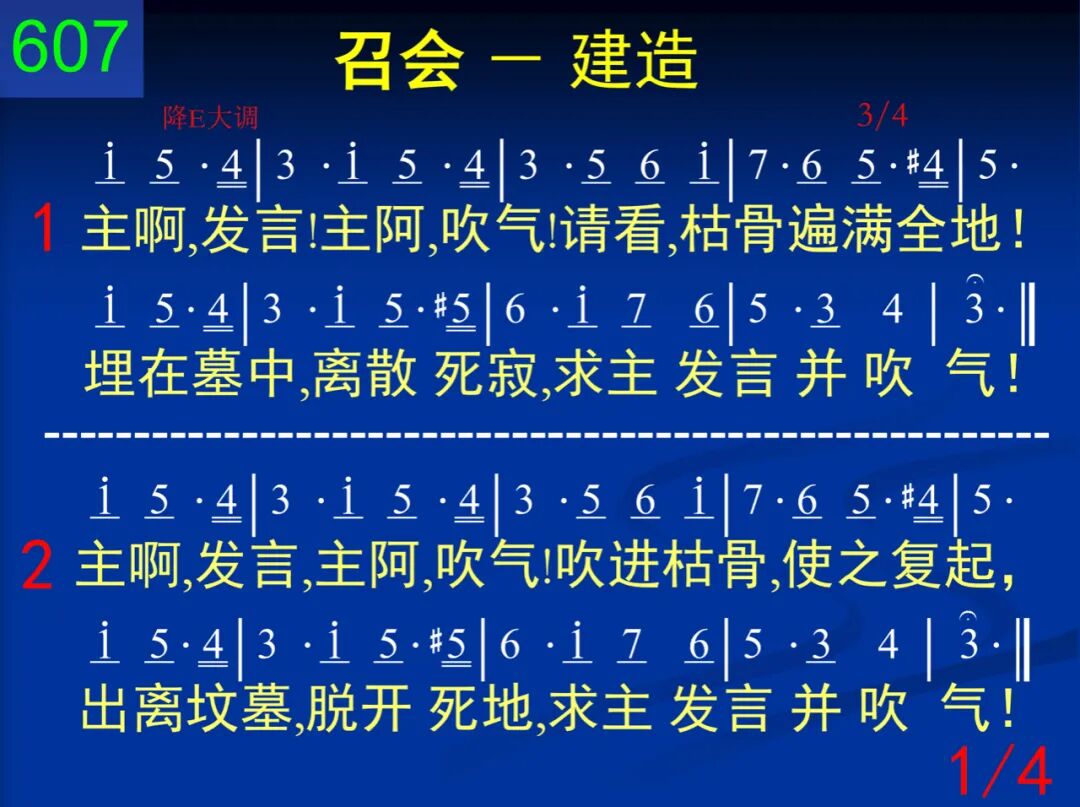 主阿,发言!主阿,吹气!请看,枯骨遍满全地!埋在墓中,离散死寂,求主发言并吹气! 二 主阿,发言,主阿,吹气!吹进枯骨,使之复起,出离坟墓,脱开死地,求主发言并吹气! 三 主阿,发言,主阿,吹气!使你子民活到一起,成为大军,向敌攻击,求主发言并吹气! 四 主阿,发言,主阿,吹气!使你子民合而为一,权柄、带领,不再互异,求主发言并吹气! 五 主阿,发言,主阿,吹气!使你子民搭成一体,作你居所,使你安息,求主发言并吹气! 六 向我发言,向我吹气!使我复苏,归回身体,不再死寂,不再孤僻,主阿,现在就吹气! 七 向我发言,向我吹气!愿与众圣进攻仇敌,使你居所早得建立,主阿,现在就吹气!
