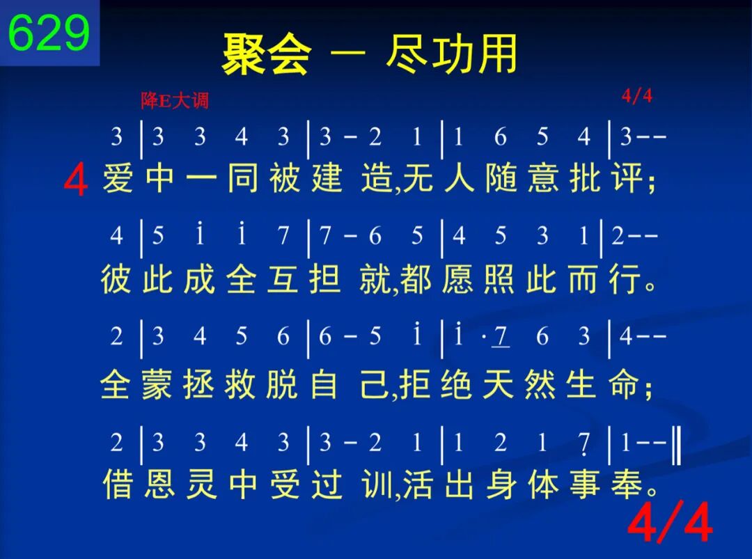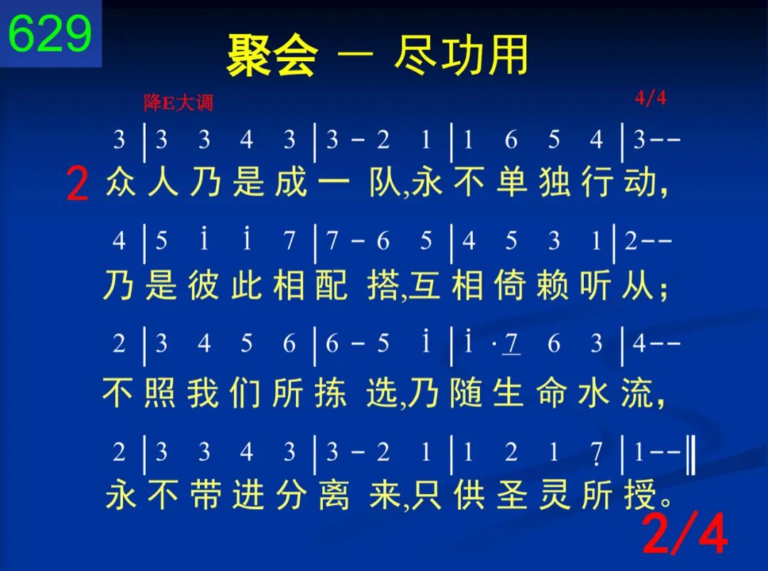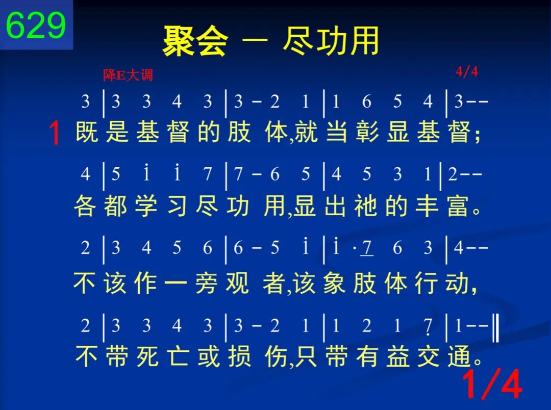 既是基督的肢体,就当彰显基督;各都学习尽功用,显出祂的丰富。不该作一旁观者,该像肢体行动,不带死亡或损伤,只带有益交通。 二 众人乃是成一队,永不单独行动,乃是彼此相配搭,互相倚赖听从;不照我们所拣选,乃随生命水流,永不带进分离来,只供圣灵所授。 三 全都集中在基督,别无任何中心,共同交通于基督,分享祂的宏恩。祂是元首并内容,我们是祂丰满;会中任何的活动,都当将祂彰显。 四 爱中一同被建造,无人随意批评;彼此成全互担就,都愿照此而行。全蒙拯救脱自己,拒绝天然生命;藉恩灵中受过训,活出身体事奉。