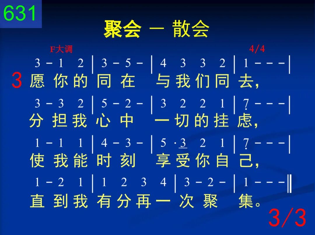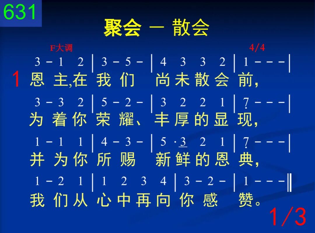 恩主,在我们尚未散会前,为着你荣耀、丰厚的显现,并为你所赐新鲜的恩典,我们从心中再向你感赞。 二 在你的恩中,聚会虽将完,但你的同在永远不间断;那在你灵里维持的能力,因爱你必要不停的供给。 三 愿你的同在与我们同去,分担我心中一切的挂虑,使我能时刻享受你自己,直到我有分再一次聚集。