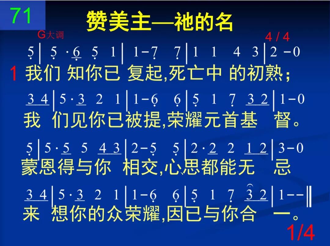 我们知你已复起,死亡中的初熟;我们见你已被提,荣耀元首基督。蒙恩得与你相交,心、思都能无忌来想你的众荣耀,因已与你合一。 二 你是万有的元首,你有最大权柄;你是以“人”升父右,你有最高的名!加略已显最高能,也显你最高爱;你爱已完全得胜,痛苦最暗残害。 三 不久万有宝珍你,万有赞美你名;不久万有承认你,向你表示欢迎。现今只有我们能认识你的大爱;能尝你爱满衷情,向你赞美不迨。 四 你名更比万名彰,你赐越乎众赐,你爱高于万爱上,永不、永不中止。我们欢乐来称道,因已合一不改;永远乃是你荣耀,永远乃是你爱。
